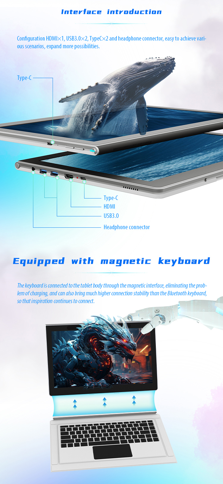 The terminal is equipped with the INTEL 12th generation new low-power and high-performance processor, which is compatible with the I7/ I5/ I3 series and supports real-time shooting of stereoscopic photos and fast scanning of 3D modeling. Multi functional integration, mobile design, lightweight and easy to carry, more suitable for teenagers to use. Supporting near-field communication technology, it can be applied to new generation information technology smart education scenarios such as K12 subject education, VR STEAM exploration classrooms, VR maker spaces, VR innovative laboratories, virtual simulation training rooms, etc.