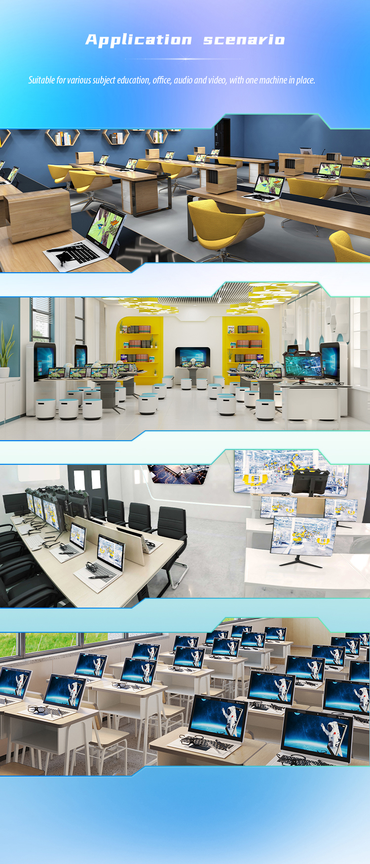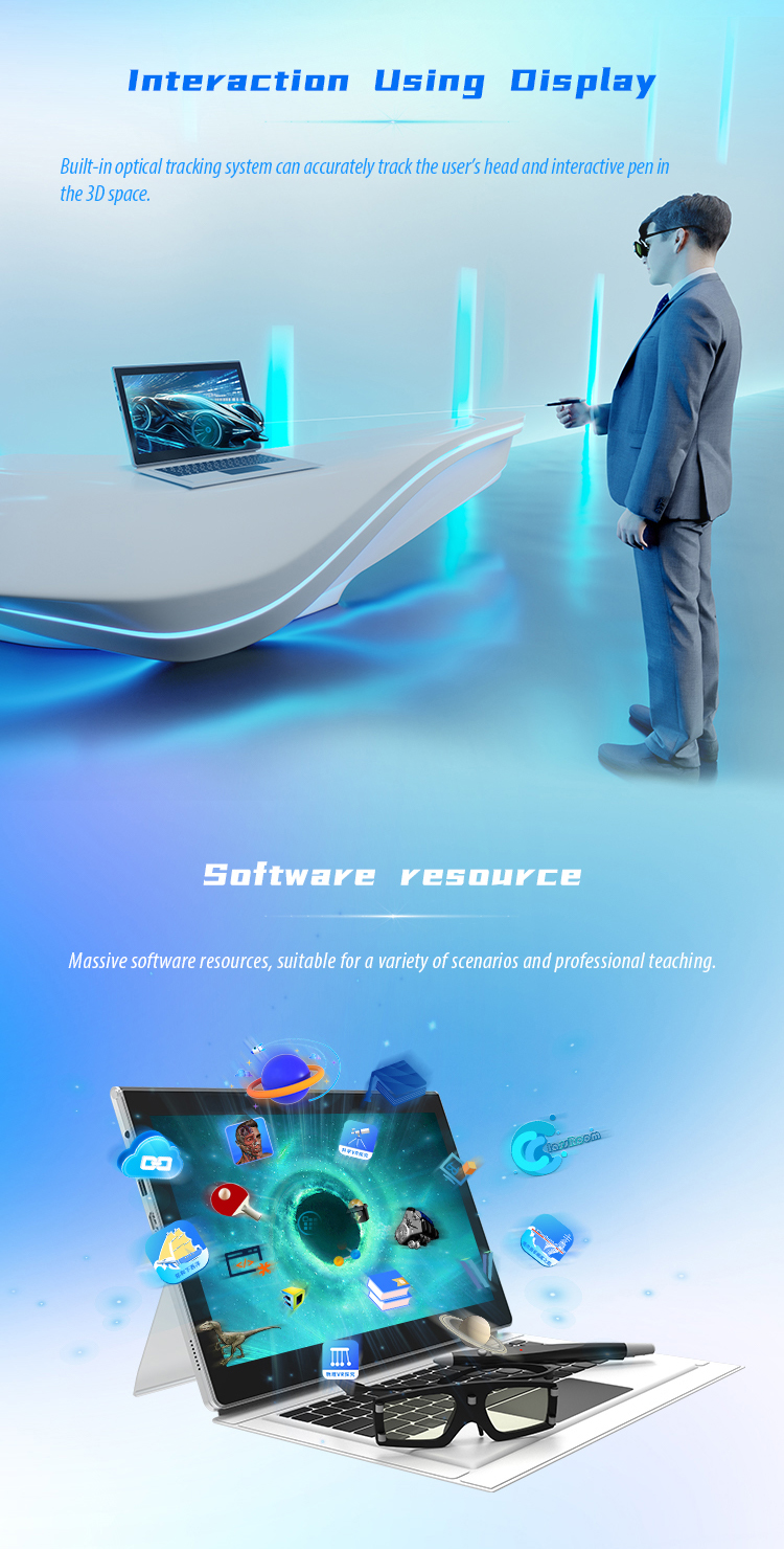 Terminals have a vast amount of 3D resources, covering various subjects such as K12, exploration experiments, 3D models, and animated videos, among many other teaching resources and courseware. Immersive VR experience, expanding knowledge learning, integrating education with entertainment, exploring the unknown, utilizing vivid virtual reality images to bring students a real classroom experience, enhancing their interest in learning, enriching the presentation of knowledge content, and assisting in efficient classroom teaching. 3D interactive mobile terminal is a groundbreaking 3D interactive product based on the concept of immersive education and learning by doing. It is centered on 3D holographic display, touch and spatial operation interaction, and artificial intelligence applications, with a 3D polarized full HD 1080P display screen as the carrier. It creates a new overall solution with "immersive", "exploratory", and "innovative" features to improve the teaching environment and enhance teaching efficiency, building an ecological practice classroom.