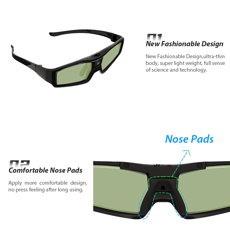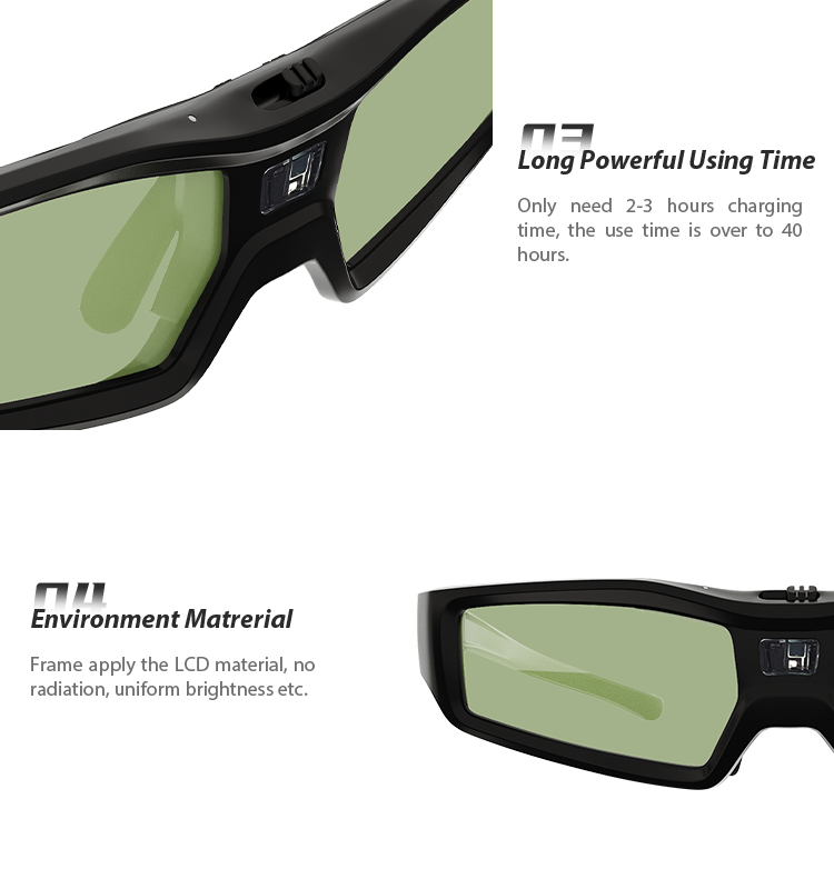 The active 3D glasses adopt professional 3D display chips, high contrast LCD shutter technology, ultra long endurance and low-power self-developed circuit design, suitable for projectors equipped with DLP-LINK 3D Ready, bringing you a better 3D viewing experience. Not only can it provide visual enjoyment, but it can also allow you to enjoy 3D content for a long time without tired feeling.