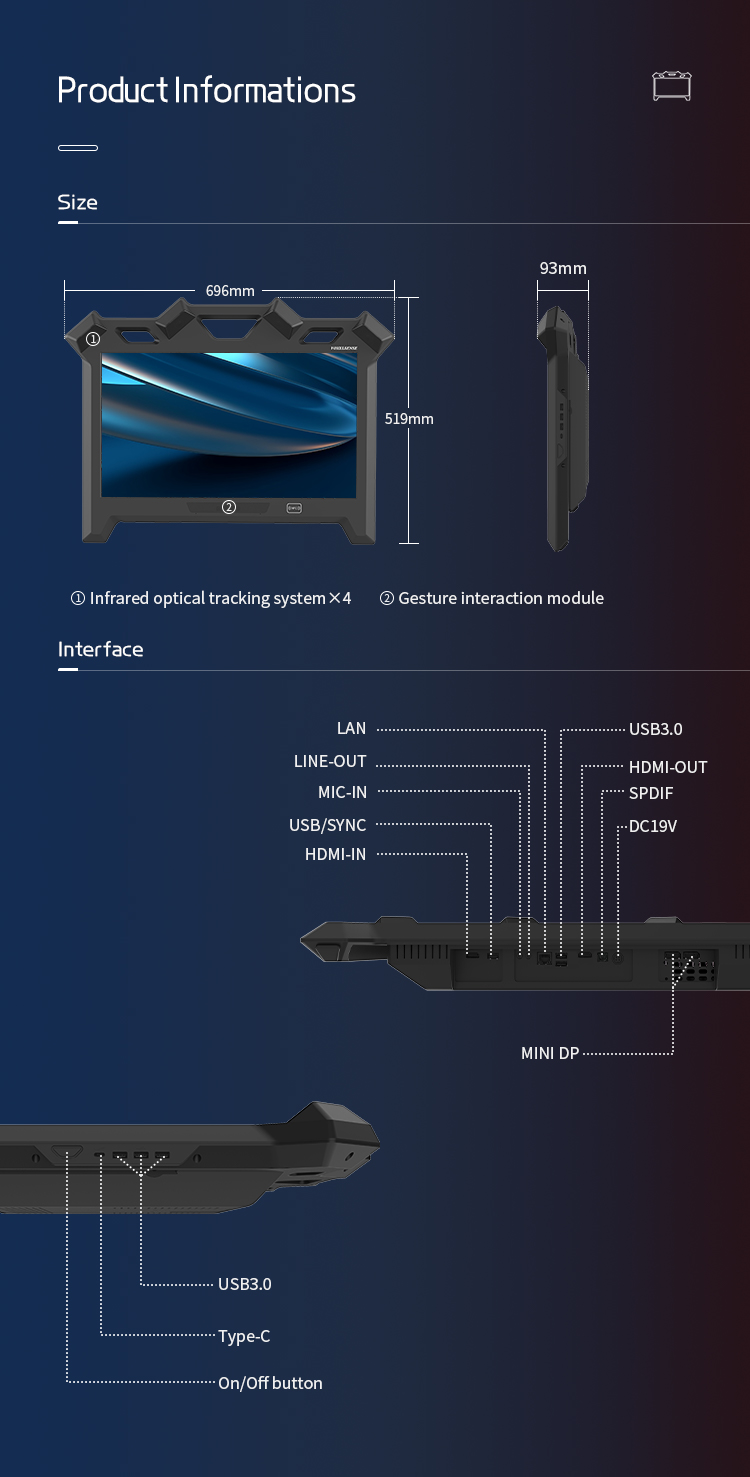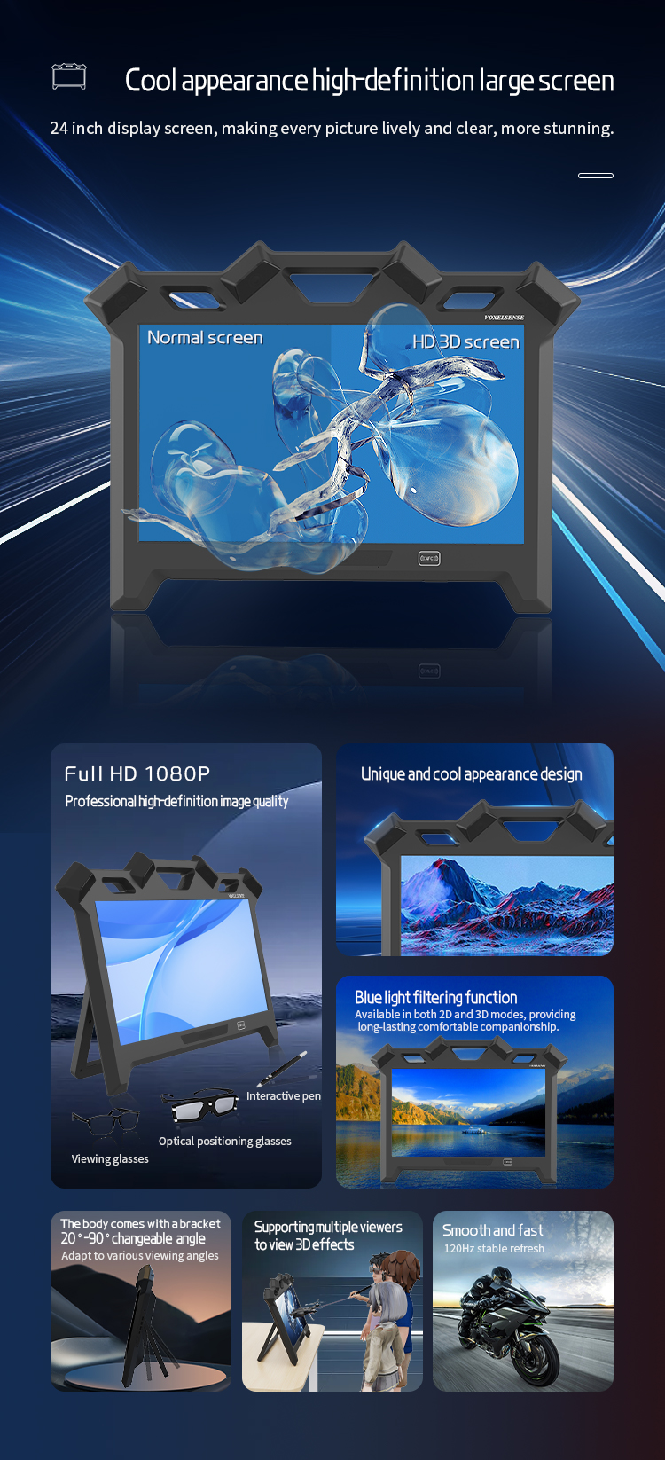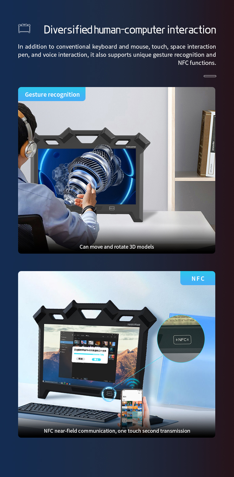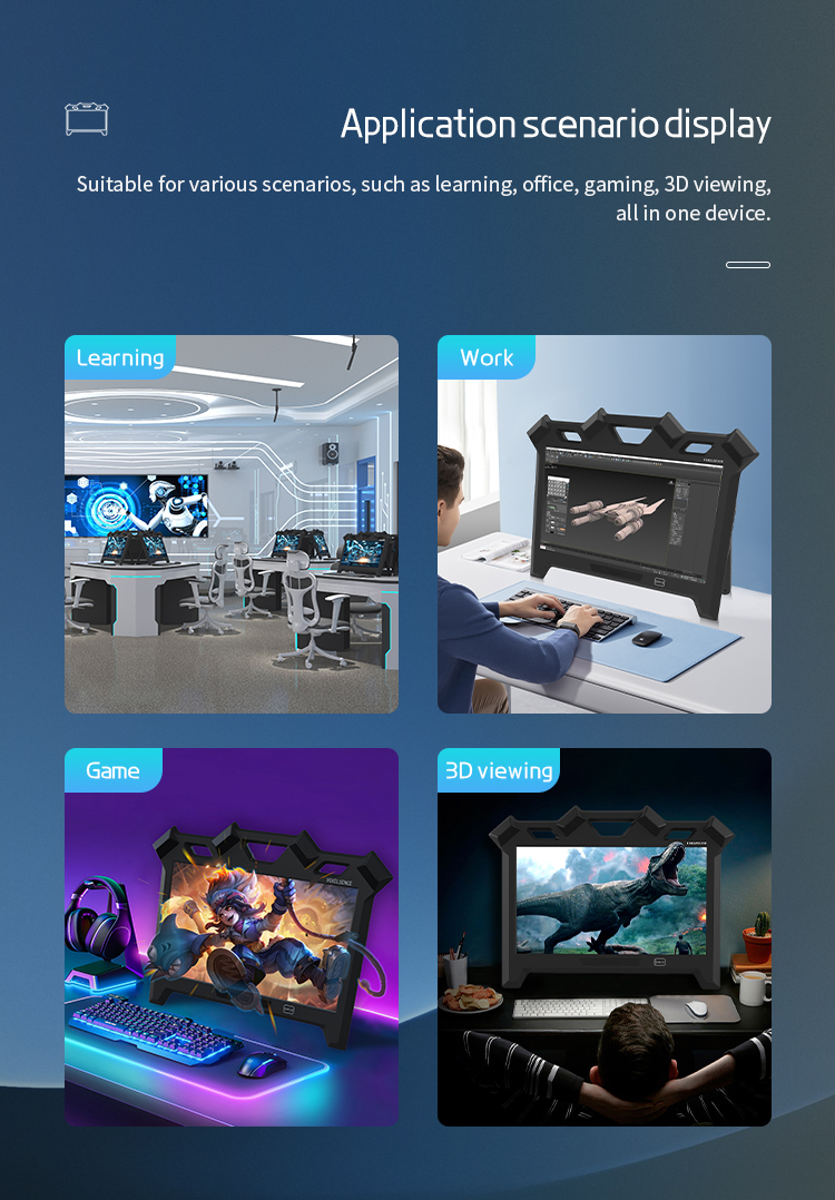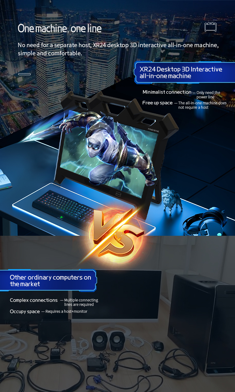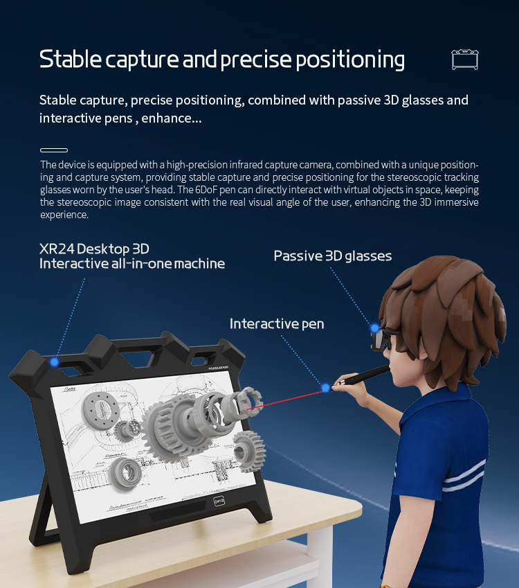 The desktop 3D interactive all-in-one machine combines augmented reality cameras with a large display screen to present the dynamic interaction between the user and the virtual world in real-time, achieving a naked eye 3D effect on the display screen.