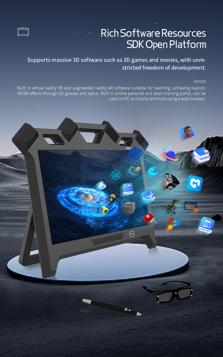 The desktop 3D interactive all-in-one machine is highly integrated with a high-definition VR screen and application service host system. The all-in-one machine is equipped with a high-precision infrared capture camera, combined with a unique positioning and capture system, to provide stable capture and precise positioning for the 3D tracking glasses worn by the user's head. The six degree of freedom touch tracking sensor pen can directly interact with virtual objects in space, keeping the 3D image consistent with the real visual angle of the user, enhancing the 3D immersive experience. It is equipped with virtual reality VR and augmented reality AR software suitable for teaching, and achieves realistic VR/AR effects through 3D glasses and touch pens.